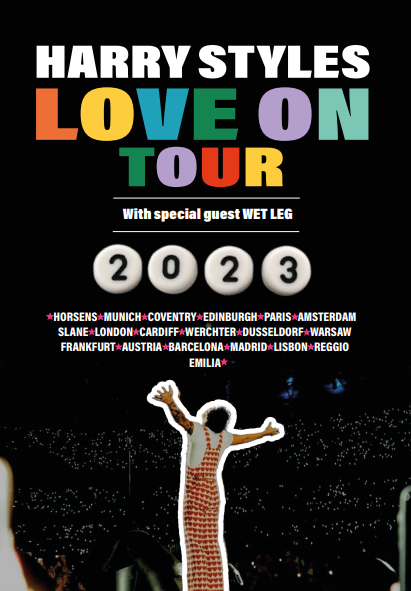 Lors de notre cours de design graphique, nous avons réalisé en binôme une affiche pour un événement culturel de notre choix, que nous avons ensuite déclinée en dépliant. Nous avons choisi de travailler sur la tournée Love On Tour de Harry Styles en 2023.
